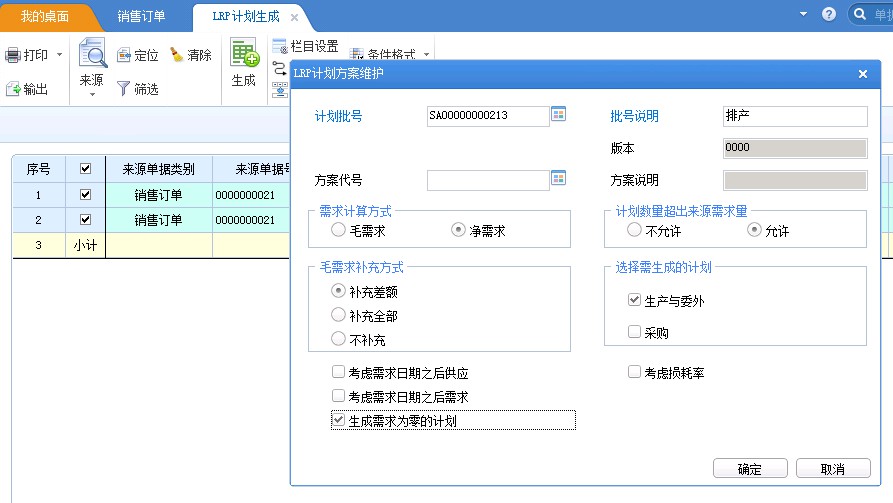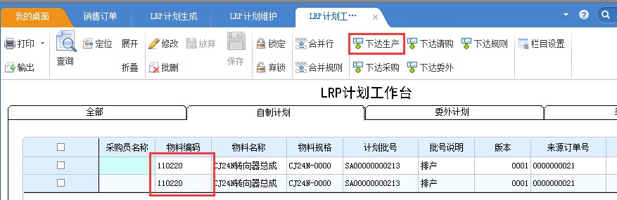 2.在LRP計(jì)劃作業(yè) - LRP計(jì)劃生產(chǎn)中查詢相應(yīng)銷售訂單,生成LRP生產(chǎn)計(jì)劃,在LRP計(jì)劃維護(hù)中聯(lián)查到相應(yīng)單據(jù)或者在LRP計(jì)劃工作臺查詢到相應(yīng)計(jì)劃,選擇需要下達(dá)生產(chǎn)的成品